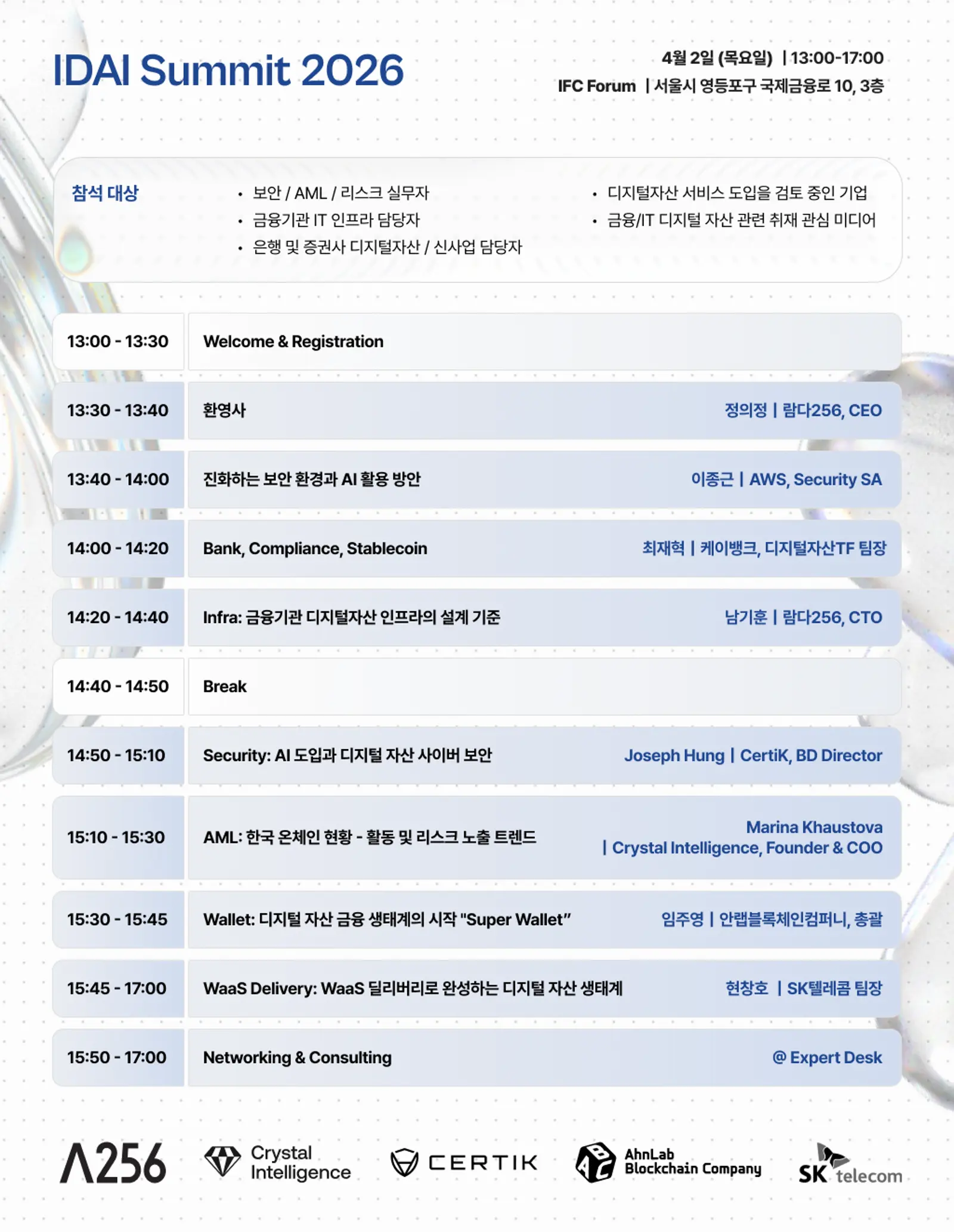 람다256, Crystal Intelligence, CertiK, 안랩블록체인컴퍼니(ABC), SK텔레콤이 공동 주최하며, 각 분야 전문가들이 제도 환경과 실제 운영 사례를 기반으로 2026년 국내 디지털 자산 산업의 방향성과 인프라 설계 기준을 공유합니다.