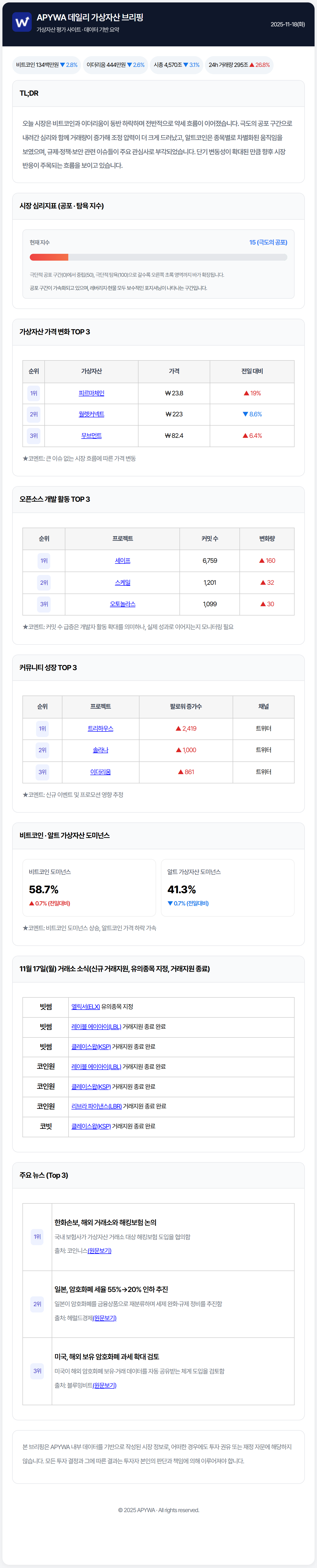 오늘 시장은 비트코인과 이더리움이 동반 하락하며 전반적으로 약세 흐름이 이어졌습니다. 극도의 공포 구간으로 내려간 심리와 함께 거래량이 증가해 조정 압력이 더 크게 드러났고, 알트코인은 종목별로 차별화된 움직임을 보였으며, 규제·정책·보안 관련 이슈들이 주요 관심사로 부각되었습니다. 단기 변동성이 확대된 만큼 향후 시장 반응이 주목되는 흐름을 보이고 있습니다.