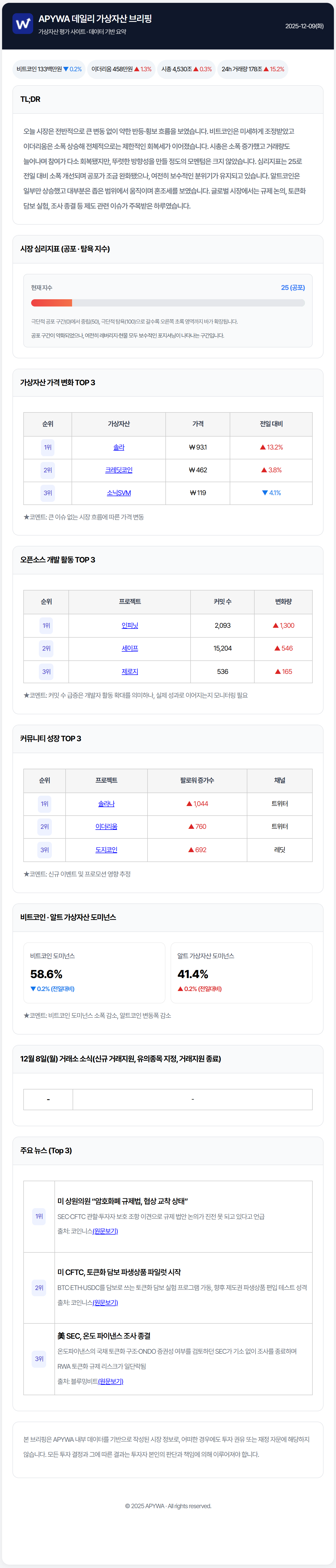 오늘 시장은 전반적으로 큰 변동 없이 약한 반등·횡보 흐름을 보였습니다. 비트코인은 미세하게 조정받았고 이더리움은 소폭 상승해 전체적으로는 제한적인 회복세가 이어졌습니다. 시총은 소폭 증가했고 거래량도 늘어나며 참여가 다소 회복됐지만, 뚜렷한 방향성을 만들 정도의 모멘텀은 크지 않았습니다. 심리지표는 25로 전일 대비 소폭 개선되며 공포가 조금 완화됐으나, 여전히 보수적인 분위기가 유지되고 있습니다. 알트코인은 일부만 상승했고 대부분은 좁은 범위에서 움직이며 혼조세를 보였습니다. 글로벌 시장에서는 규제 논의, 토큰화 담보 실험, 조사 종결 등 제도 관련 이슈가 주목받은 하루였습니다.