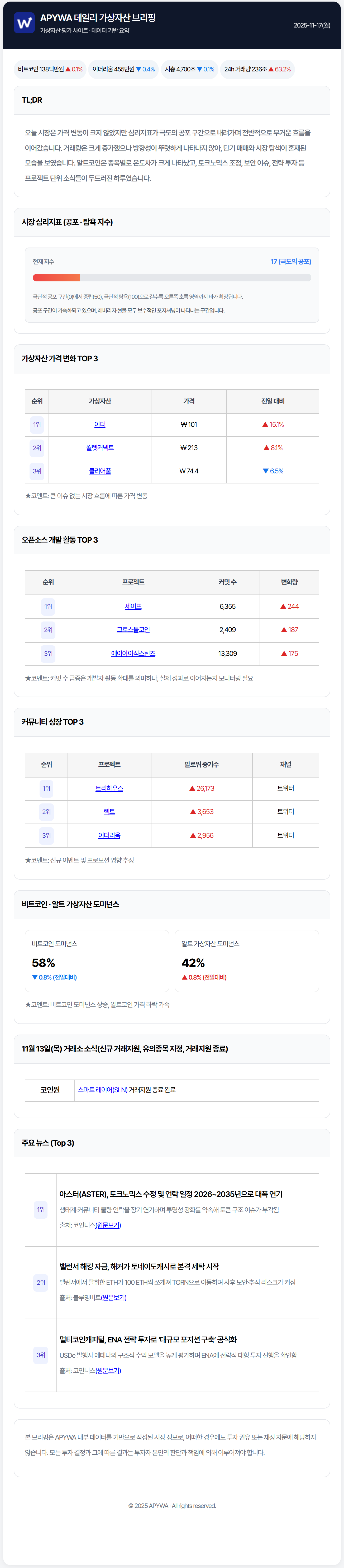 오늘 시장은 가격 변동이 크지 않았지만 심리지표가 극도의 공포 구간으로 내려가며 전반적으로 무거운 흐름을 이어갔습니다. 거래량은 크게 증가했으나 방향성이 뚜렷하게 나타나지 않아, 단기 매매와 시장 탐색이 혼재된 모습을 보였습니다. 알트코인은 종목별로 온도차가 크게 나타났고, 토크노믹스 조정, 보안 이슈, 전략 투자 등 프로젝트 단위 소식들이 두드러진 하루였습니다.