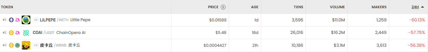 반면 가장 크게 하락한 거래쌍은 60.13% 떨어진 LILPEPE/WETH (Little Pepe)였다. 이어 COAI/USDT (ChainOpera AI)가 57.75%, 皮卡丘/WBNB (皮卡丘)가 56.38% 하락했다.