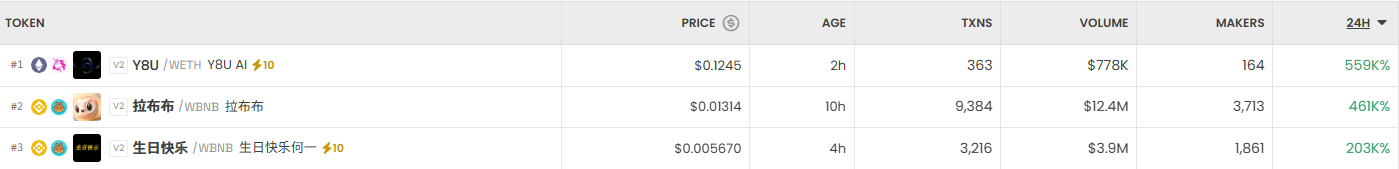 하루 동안 DEX에서 가장 크게 오른 거래쌍은 55만9000% 급등한 Y8U/WETH (Y8U AI)였다. 이어 拉布布/WBNB (拉布布)가 46만1000%, 生日快乐/WBNB (生日快乐)가 20만3000% 상승했다.