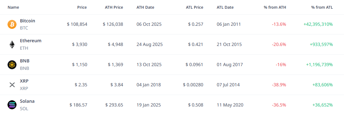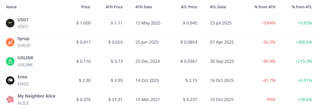 [편집자주] 암호화폐 시장은 하루 새 고점과 저점이 빠르게 바뀌는 고변동성 환경이다. 역대 최고가(ATH)와 역대 최저가(ATL) 경신 종목을 추적하면 강세와 약세 흐름을 조기에 포착할 수 있다. 크립토랭크 기준 시가총액 1000만 달러 이상 종목 중 하루 사이 고점 또는 저점을 경신한 주요 토큰을 정리하고 시가총액 상위 종목과 실시간 국내 인기 자산의 고점 대비 조정률을 함께 분석해 시장 회복 여력과 흐름을 진단한다.