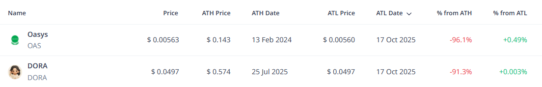 ▲오아시스(OAS) ▲도라(DORA) 2개 종목이 신저점을 경신하며 단기적인 약세 흐름이 이어지고 있다. 두 종목 모두 올해 들어 최고점(ATH) 대비 90% 이상 하락하며 가격 부담이 완화된 반면 저점 대비 반등 폭은 아직 미미한 수준이다. 시장에서는 이들 프로젝트가 향후 생태계 확장성과 거래량 회복 여부에 따라 기술적 반등 가능성을 모색할 것으로 보고 있다.