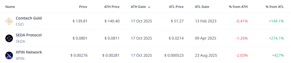 ▲컴테크골드(CGO) ▲세다프로토콜(SEDA) ▲엑스핀네트워크(XPIN) 3개 종목이 신고점을 경신하며 시장의 회복세를 이끌었다. 특히 세다프로토콜과 엑스핀네트워크는 최근 거래량이 급증하며 단기 상승세를 견인했고 컴테크골드는 안정적인 상승 흐름을 유지하며 금 기반 자산의 강세를 반영했다. 전반적으로 주요 프로젝트들이 기술적 저항선을 돌파하며 강세 전환 신호를 강화하는 모습이다.