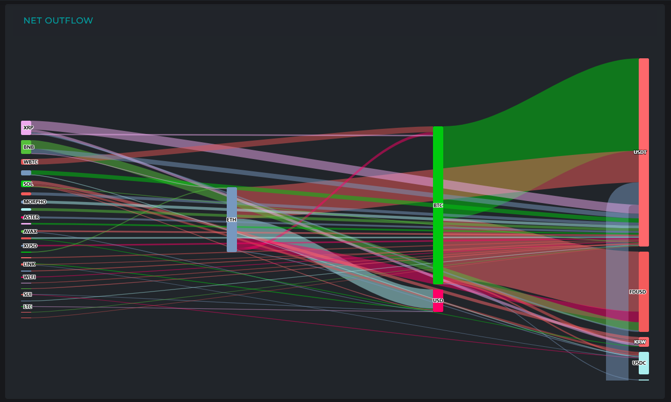 BTC에서는 ▲USDT(2억1220만 달러) ▲FDUSD(1억4220만 달러) ▲원화(670만 달러) ▲USDC(300만 달러) ▲파운드화(200만 달러) 등으로 자금이 빠져나갔다. 비트코인에서 스테이블코인으로의 이동이 약 95% 이상을 차지하며 시장 내 보수적 포지션 전환이 강화된 모습이다.