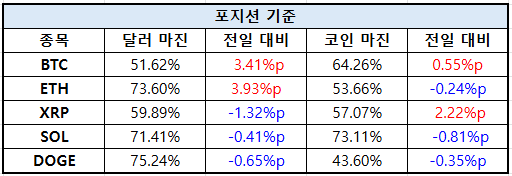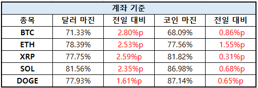 솔라나는 달러 마진 81.56%로 2.35%p 증가했고 코인 마진은 86.98%로 0.68%p 상승했다. 도지코인은 달러 마진 77.93%로 1.61%p 상승하며 매수세가 이어졌고 코인 마진은 87.14%로 0.65%p 증가했다.