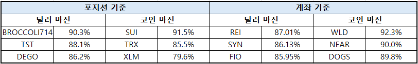 상위 트레이더 기준 종목별 포지션 비중을 살펴보면, 포지션 기준 달러 마진 시장에서는 ▲BROCCOLI714(90.3%) ▲TST(88.1%) ▲DEGO(86.2%) 순으로 롱 포지션 비중이 높았다. 코인 마진 시장에서는 ▲SUI(91.5%) ▲TRX(85.5%) ▲XLM(79.6%)이 상위권을 차지했다.