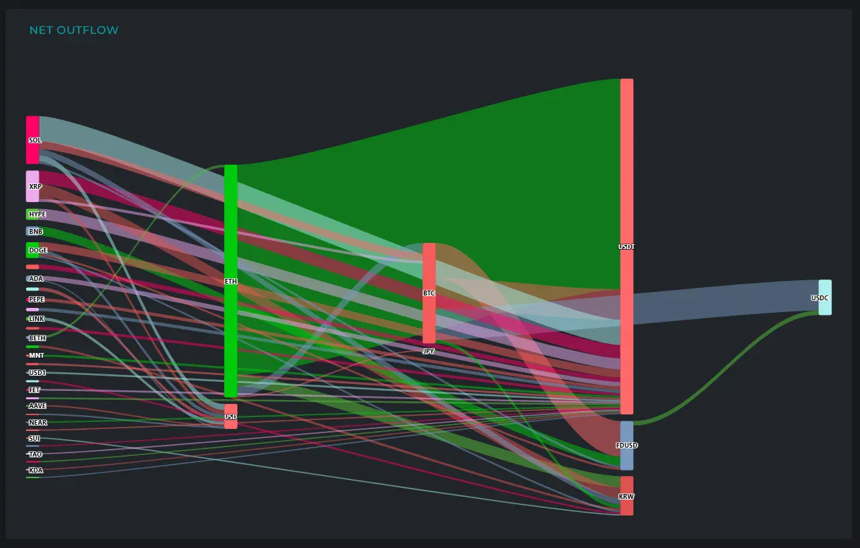 DOGE에서는 총 2380만 달러 규모의 자금이 빠져나갔다. 이 중 ▲USDT(1210만 달러)로의 이동이 가장 많았다. 이외에도 ▲USD(580만 달러) ▲KRW(290만 달러) ▲FDUSD(310만 달러) 등으로 자금이 분산됐다.