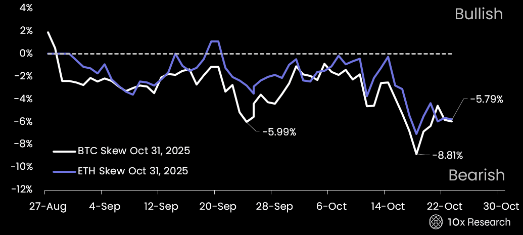 23일 암호화폐 분석업체 10x리서치는 공식 채널을 통해 “비트코인과 이더리움 옵션 시장이 단기 변동성 확대 가능성에 대비하고 있으나 아직 투매 수준의 공포는 아니다”라고 진단했다.