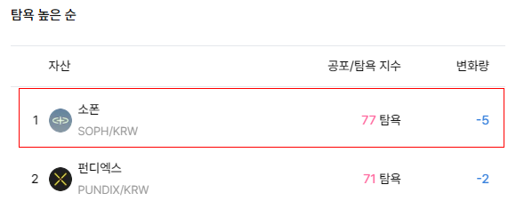 소폰(SOPH)이 23일 오후 업비트에서 전일 대비 0.66% 하락한 45.3원에 거래되고 있다. 24시간 거래대금은 약 229억 원 규모로, 단기 조정세 속에서도 거래 활발도가 유지되고 있다. 업비트 공포·탐욕 지수에서 탐욕 점수 77포인트로 1위를 기록하며, 전반적인 시장 약세에도 불구하고 투자자들의 관심이 이어지고 있다.