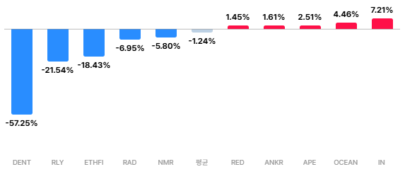 역프리미엄 구간 DENT(–57.25%)|RLY(–21.54%)|ETHFI(–18.43%)|RAD(–6.95%)|NMR(–5.80%)
