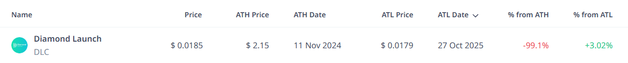 이날 DLC 1개 종목이 신저점을 경신했다. 다이아몬드 런치는 전고점(ATH) 대비 99% 이상 하락하며 극단적인 조정을 거친 뒤 최근 소폭 반등세를 보이고 있다. 장기 하락 후 기술적 저점을 통과한 흐름으로 거래량 회복 여부가 향후 단기 추세 반전의 핵심 변수로 꼽힌다.