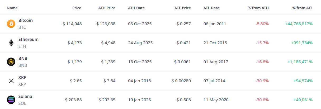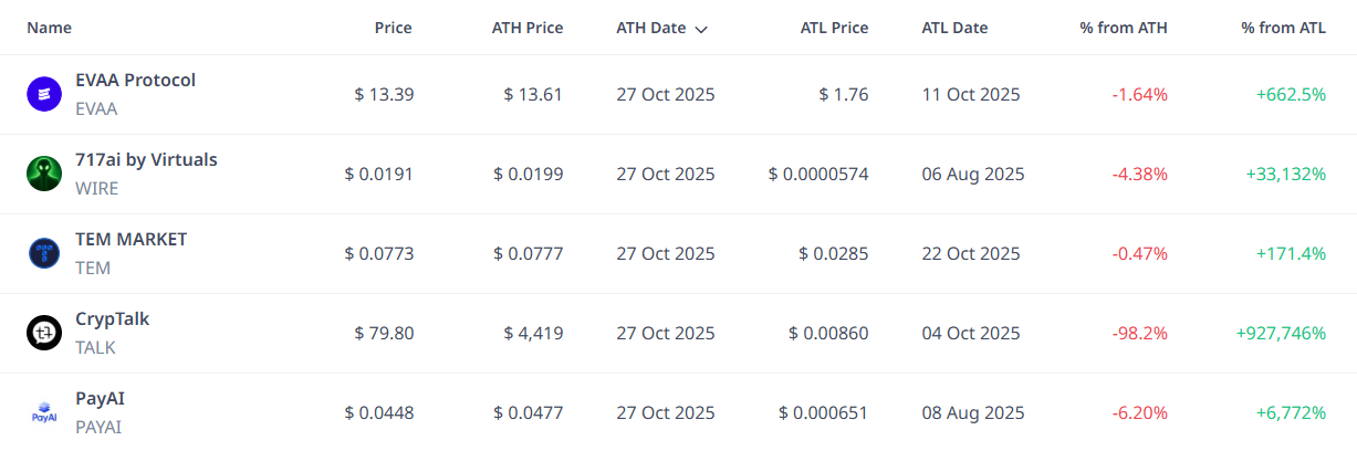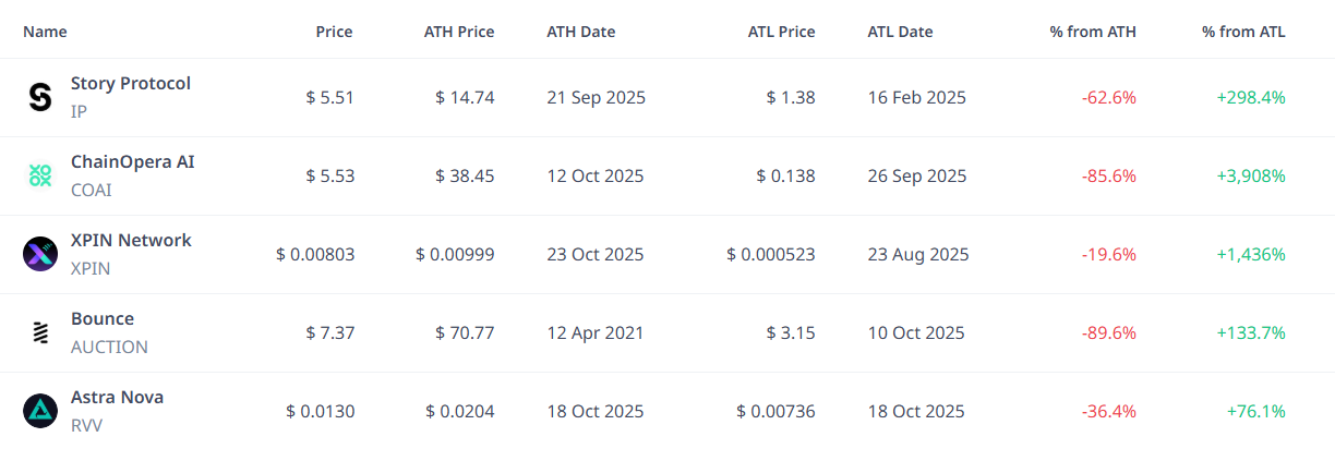 [편집자주] 암호화폐 시장은 하루 새 고점과 저점이 빠르게 바뀌는 고변동성 환경이다. 역대 최고가(ATH)와 역대 최저가(ATL) 경신 종목을 추적하면 강세와 약세 흐름을 조기에 포착할 수 있다. 크립토랭크 기준 시가총액 1000만 달러 이상 종목 중 하루 사이 고점 또는 저점을 경신한 주요 토큰을 정리하고 시가총액 상위 종목과 실시간 국내 인기 자산의 고점 대비 조정률을 함께 분석해 시장 회복 여력과 흐름을 진단한다.