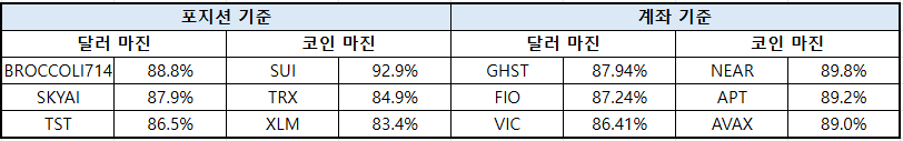 상위 트레이더 기준 종목별 포지션 비중을 살펴보면, 포지션 기준 달러 마진 시장에서는 ▲BROCCOLI714(88.8%) ▲SKYAI(87.9%) ▲TST(86.5%) 순으로 롱 포지션 비중이 높았다. 코인 마진 시장에서는 ▲SUI(92.9%) ▲TRX(84.9%) ▲XLM(83.4%)이 상위권을 차지했다.