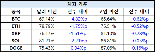 이더리움은 달러 마진 78.79%로 1.75%p 하락, 코인 마진은 75.51%로 0.52%p 줄었다. XRP는 달러 마진 76.17%로 1.61%p, 코인 마진은 81.10%로 0.28%p 감소하며 전반적인 약세를 보였다.