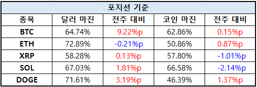 솔라나는 달러 마진 67.03%로 1.81%p 상승했지만, 코인 마진은 66.58%로 2.14%p 하락하며 엇갈린 흐름을 보였다. 도지코인은 달러 마진 71.61%로 3.19%p 상승, 코인 마진은 46.39%로 1.37%p 늘며 강세를 이어갔다.