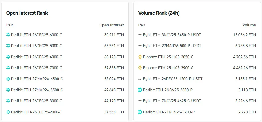 가장 많은 미결제약정이 쏠린 옵션 계약은 ▲6000달러 콜옵션(12월 26일 만기, 8만211 ETH) ▲5000달러 콜옵션(12월 26일, 6만5551 ETH) ▲4000달러 콜옵션(12월 26일, 6만123 ETH) 순으로 집계됐다.