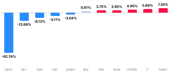 역프리미엄 구간 DENT(–62.74%)|RLY(–12.68%)|RSR(–8.13%)|LRC(–5.11%)|JASMY(–3.04%)