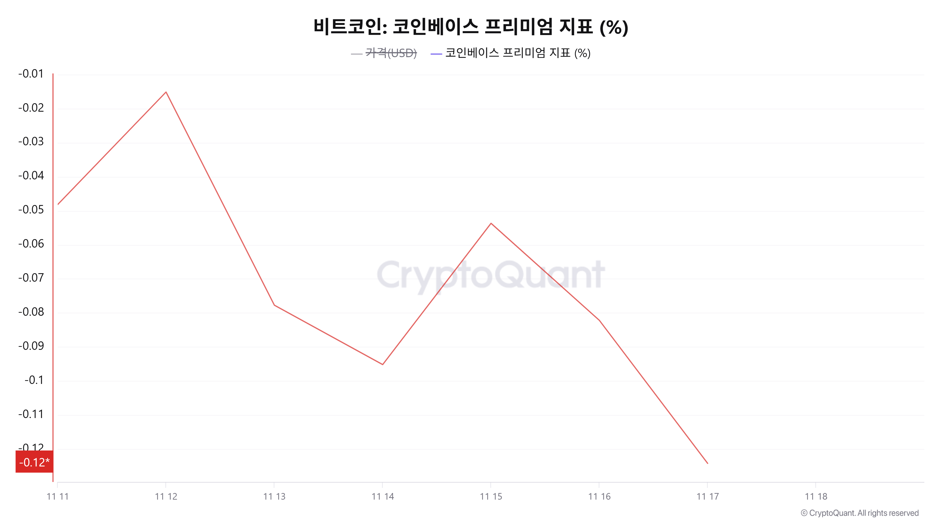 최근 일주일간 흐름을 보면 ▲11일 –0.0481% ▲12일 –0.0150% ▲13일 –0.0777% ▲14일 –0.0950% ▲15일 –0.0530% ▲16일 –0.0821% ▲17일 –0.1242% 등 전반적으로 음(-)의 프리미엄이 지속되며 글로벌 시장 대비 코인베이스 가격이 낮게 형성되는 경향이 이어졌다.