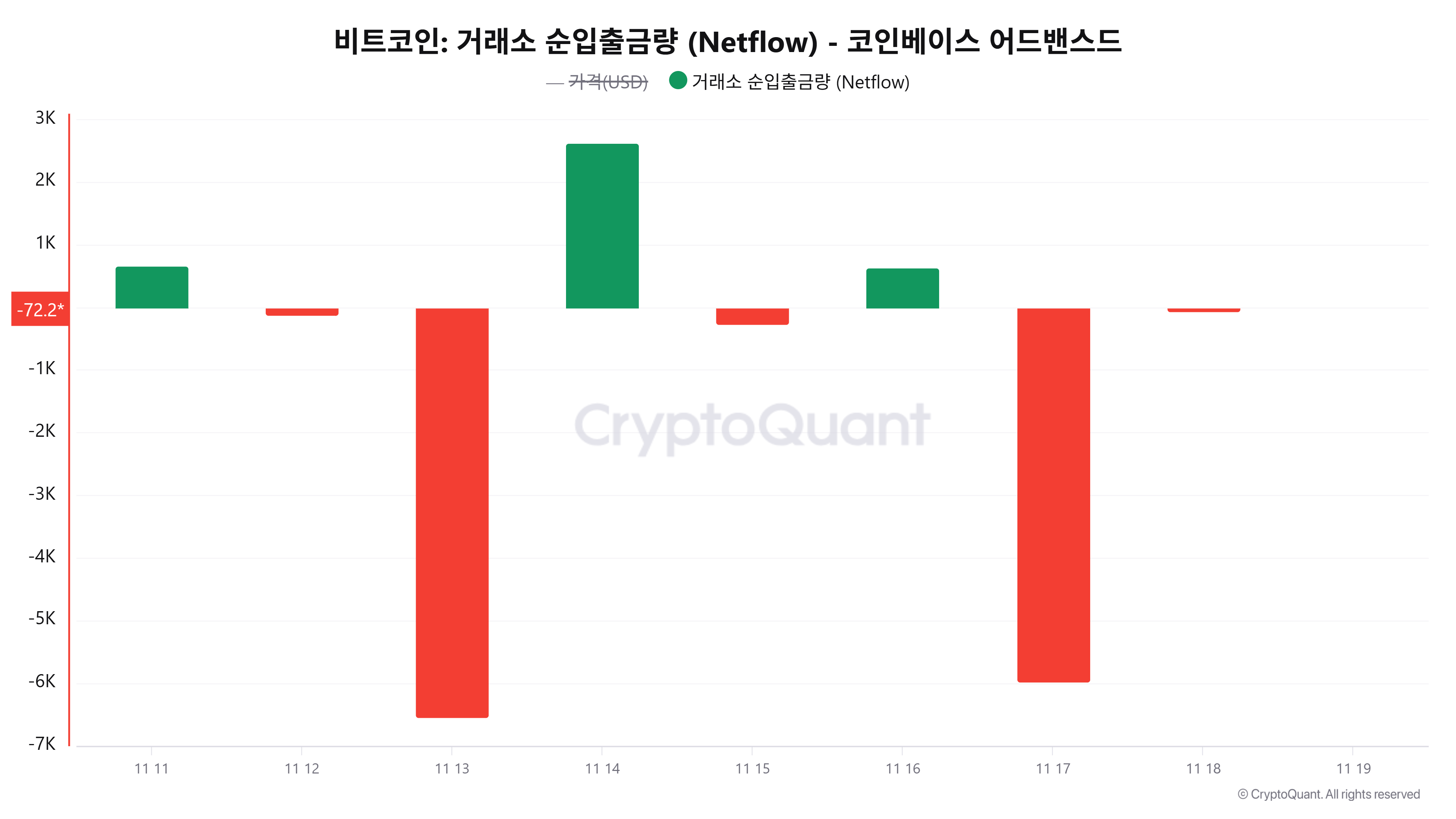 크립토퀀트 데이터에 따르면 18일(UTC 기준, 미완결) 코인베이스 비트코인 순입출금(Netflow)은 –72.26BTC 순유출을 기록했다.