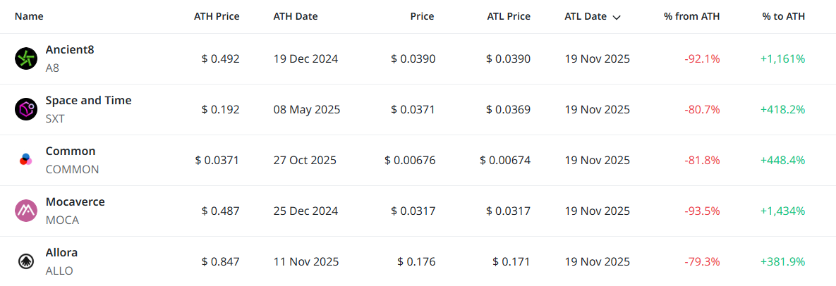 이 외에도 ▲모리코인(MORI) ▲지피톤(GPTON)까지 7개 종목이 신저점을 경신했다. 전체 7개 종목이 최근 24시간 기준 사상 최저가(ATL)를 새로 기록했으며, 대부분 알트코인 시장의 조정세 속에서 단기 저항선을 재확인하는 흐름을 보였다. 특히 엔션트8과 모카버스는 전 고점 대비 각각 92%, 93% 이상 하락하며 장기 조정 구간에 머물러 있다.