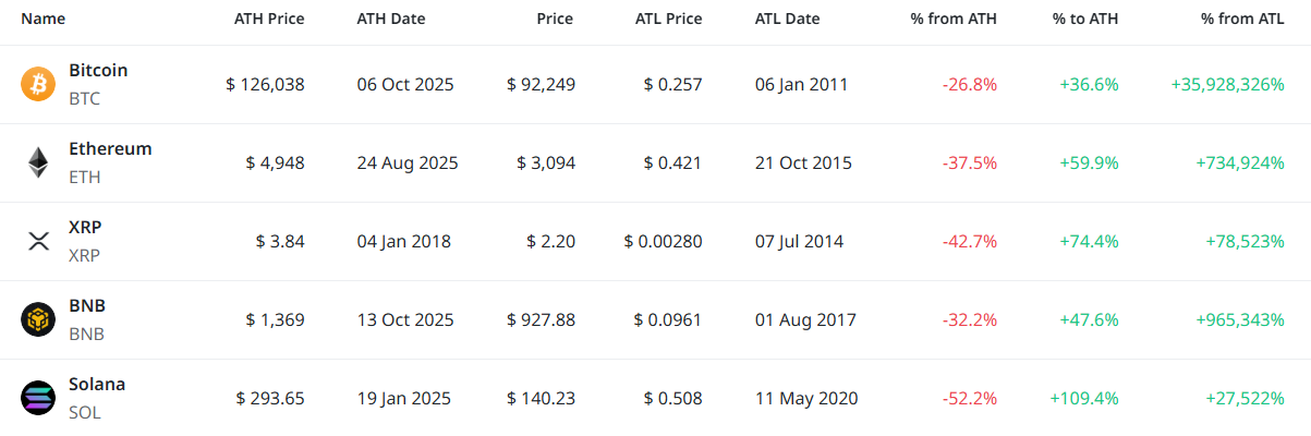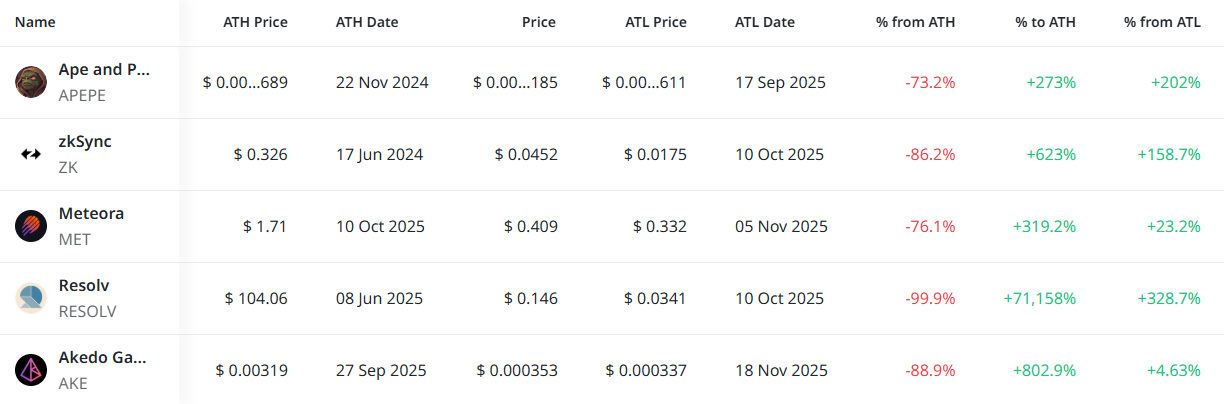 [편집자주] 암호화폐 시장은 하루 새 고점과 저점이 빠르게 바뀌는 고변동성 환경이다. 역대 최고가(ATH)와 역대 최저가(ATL) 경신 종목을 추적하면 강세와 약세 흐름을 조기에 포착할 수 있다. 크립토랭크 기준 시가총액 1000만 달러 이상 종목 중 하루 사이 고점 또는 저점을 경신한 주요 토큰을 정리하고 시가총액 상위 종목과 실시간 국내 인기 자산의 고점 대비 조정률을 함께 분석해 시장 회복 여력과 흐름을 진단한다.