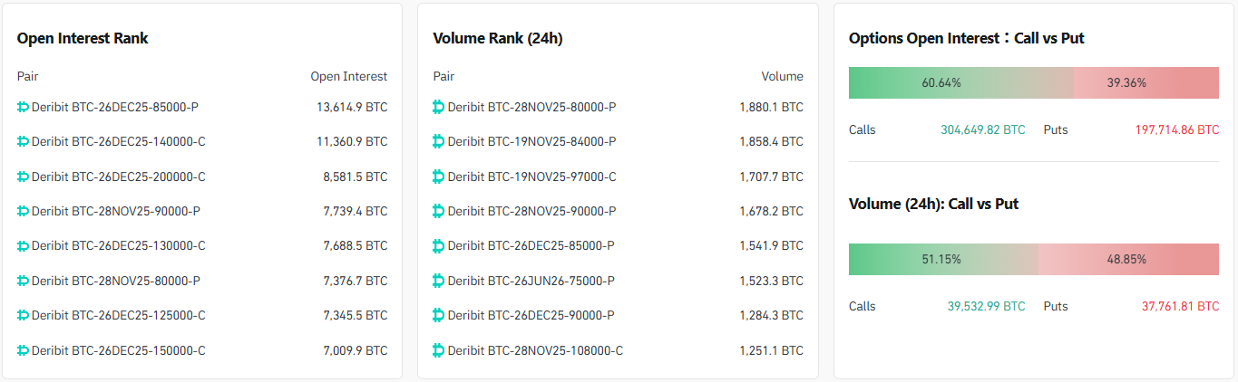 미결제약정 구성은 콜옵션 60.64%, 풋옵션 39.36%로 콜 비중이 뚜렷한 우위를 이어갔다. 다만 24시간 거래량 기준에서는 콜옵션 51.15%, 풋옵션 48.85%로 양쪽의 균형이 좁혀지며 단기 변동성 경계심리가 나타났다.