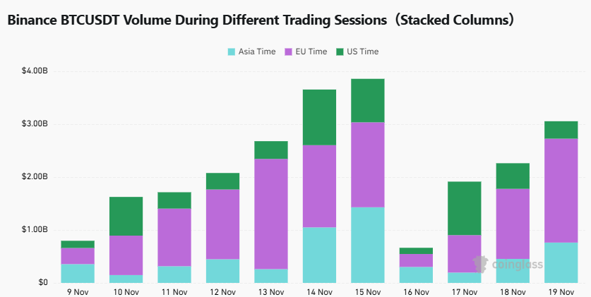 바이낸스 BTCUSDT 거래량은 아시아 시간대 7억6221만 달러, 유럽 시간대 19억6000만 달러, 미국 시간대 3억2960만 달러로 집계됐다.