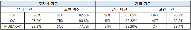 상위 트레이더 기준 종목별 포지션 비중을 보면, 포지션 기준 달러 마진 시장에서는 TST(89.8%), OG(85.2%), MUBARAK(82.9%) 순으로 롱 포지션 비중이 높았다. 코인 마진 시장에서는 BCH(82.5%), TRX(80.6%), SOL(77.7%)이 상위권을 기록했다.