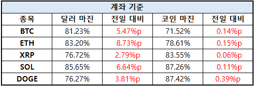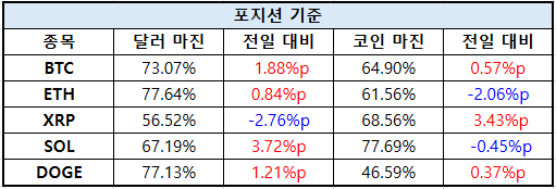 XRP는 달러 마진 76.72%(+2.79%p), 코인 마진 83.55%(+0.06%p)로, 두 시장 모두 소폭 상승했다.