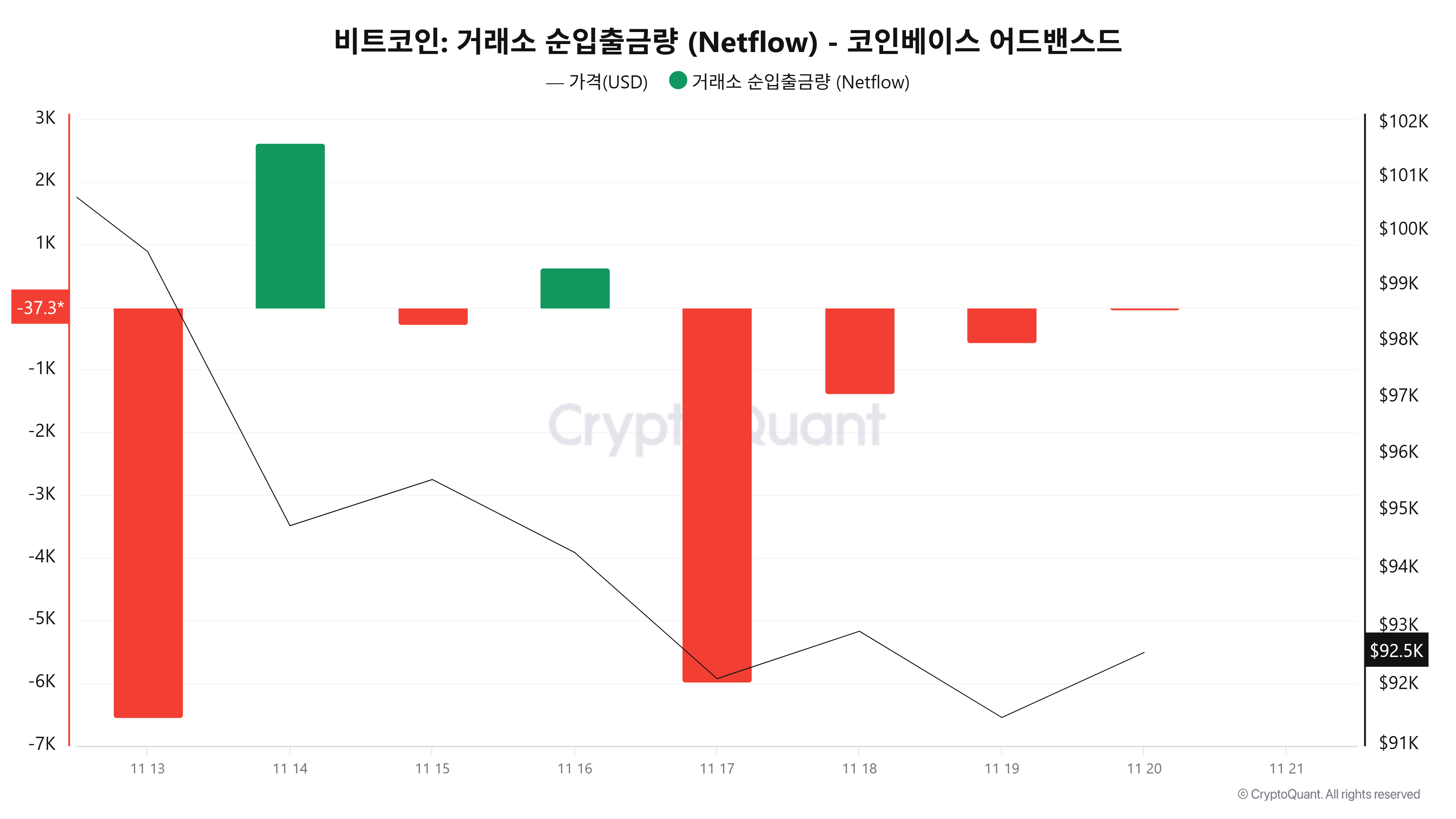 크립토퀀트 데이터에 따르면 20일(UTC 기준, 미완결) 코인베이스 비트코인 순입출금(Netflow)은 –37.33BTC 순유출을 기록했다.