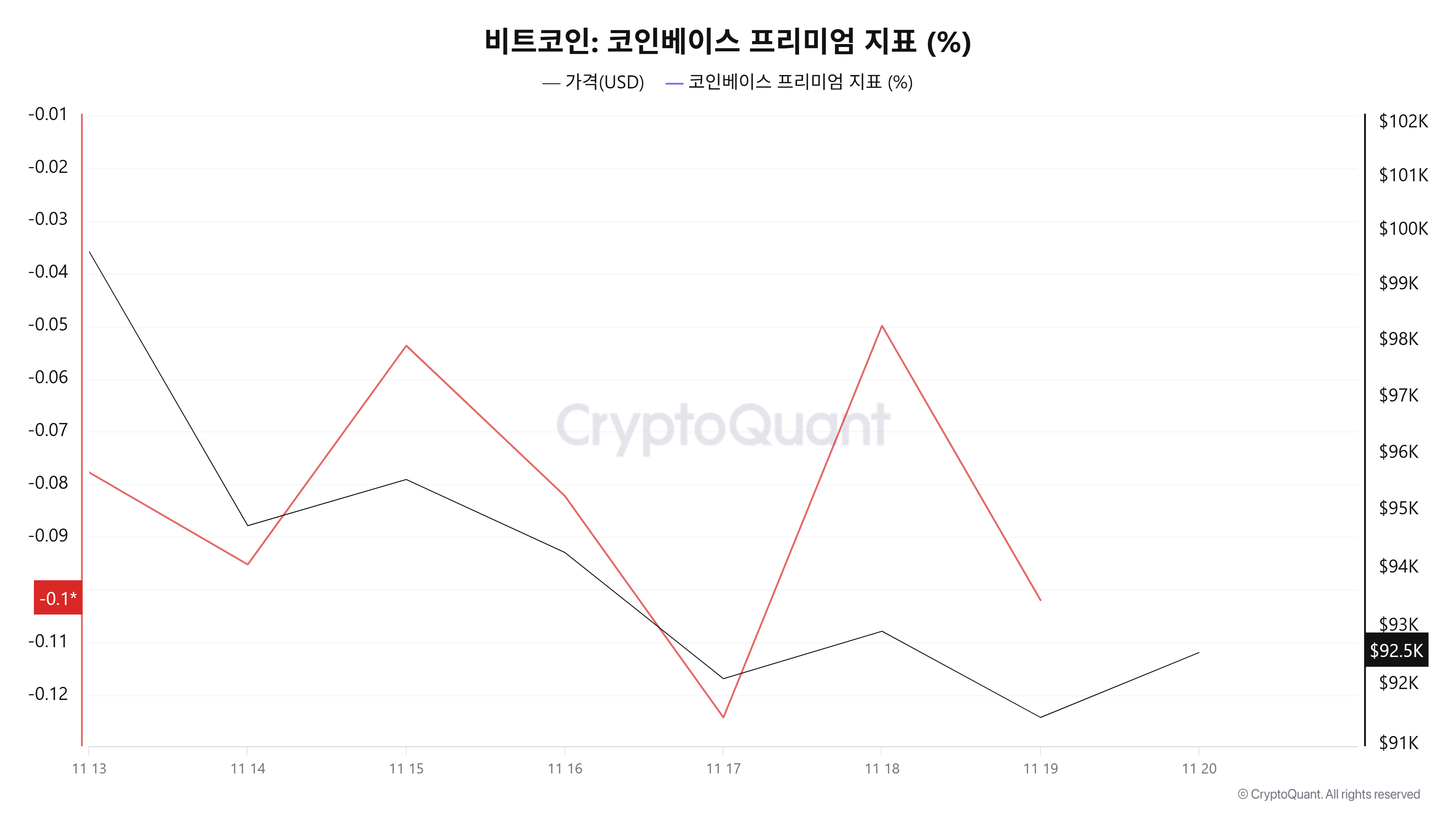 최근 일주일간 흐름을 보면 ▲14일 –0.0952% ▲15일 –0.0537% ▲16일 –0.0821% ▲17일 –0.1242% ▲18일 –0.0499% ▲19일 –0.1019% 등 전반적으로 음(–)의 프리미엄이 지속되며 글로벌 시장 대비 코인베이스 가격이 낮게 형성되는 경향이 유지됐다.