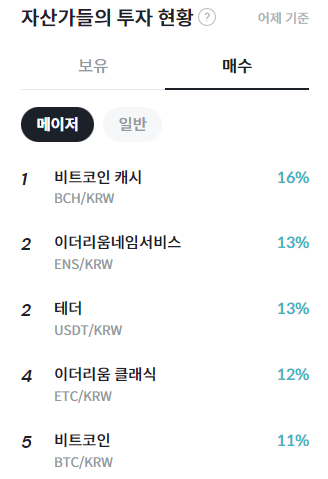 빗썸 집계에 따르면 비트코인 캐시는 매수 비중 16%로 가장 높은 수치를 기록했다. 이더리움네임서비스와 테더는 각각 13%로 뒤를 이었으며, 이더리움 클래식(12%)과 비트코인(11%)도 상위권에 포함됐다. 메이저 코인과 스테이블코인을 중심으로 한 비교적 안정적인 매수 흐름이 관측된다.