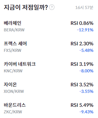 이 외에도 프랙스 셰어(FXS), 카이버 네트워크(KNC), 자이온(XION), 바운드리스(ZKC) 등이 RSI 30 이하의 과매도 구간에 머물고 있다. 특히 베라체인은 RSI가 1% 미만으로 떨어지며 단기 기술적 반등 가능성에 대한 시장의 관심이 집중되고 있다.