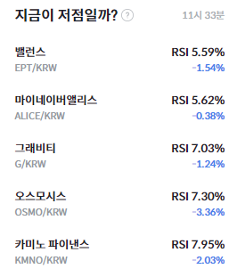 한편 빗썸의 상대강도지수(RSI)에 따르면 오늘 오전 11시 33분 기준 밸런스(EPT)는 RSI 5.59%를 기록하며 과매도 구간에 진입한 것으로 나타났다. 이와 함께 마이네이버앨리스(ALICE), 그래비티(G), 오스모시스(OSMO), 카미노 파이낸스(KMNO) 등도 RSI 30 이하에 머물며 단기적으로 가격 조정 압력이 누적된 상태다.