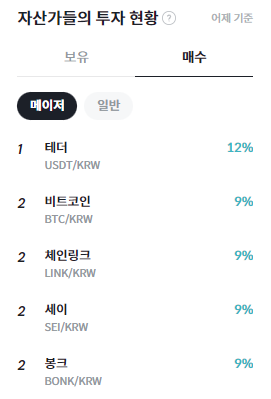 빗썸 집계에 따르면 어제 기준 자산가들의 매수 비중은 테더가 12%로 가장 높았으며, 비트코인(BTC), 체인링크(LINK), 세이(SEI), 봉크(BONK)가 각각 9%로 뒤를 이었다. 해당 지표는 빗썸 내 자산 규모 상위 5,000명의 순매수 거래금액 비율을 기준으로 산출되며, 상위 투자자들의 전반적인 자금 흐름을 보여준다. 스테이블코인과 메이저 코인을 중심으로 한 안정 지향적 매수 성향이 이어지는 모습이다.