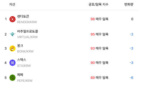 이날 공포·탐욕 지수 상위권에는 렌더토큰 외에도 버추얼프로토콜(VIRTUAL), 봉크(BONK), 스택스(STX), 페페(PEPE) 등이 포함됐다. 이들 종목 역시 탐욕지수 90포인트 안팎을 기록하며 단기 투자 심리가 크게 반영된 흐름을 보였다.