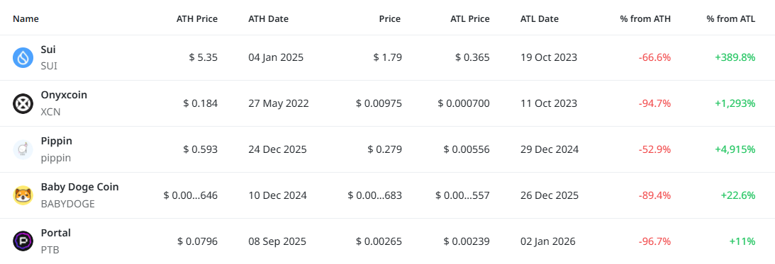 국내 트렌딩 상위 5개 종목은 전반적으로 전고점 대비 큰 폭의 조정을 거친 이후 저점 대비 반등 국면에 위치해 있다. 특히 오닉스코인과 피핀은 ATL 대비 수백~수천 퍼센트 상승하며 극단적인 변동성을 보였고, 베이비도지코인과 포털 투 비트코인은 고점 대비 낙폭이 여전히 큰 상태다. 수이는 메이저 체인 가운데 비교적 안정적인 회복 흐름을 보이며 관심을 끌고 있다.