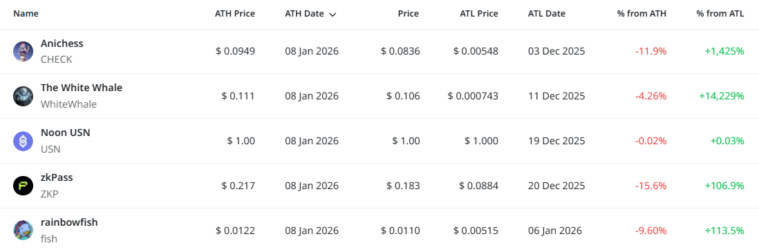 이들 종목은 8일 기준 모두 사상 최고가를 경신한 이후 단기 조정 국면에 진입한 모습이다. 아니체스와 지케이패스는 ATH 대비 두 자릿수 조정률을 보이며 변동성이 확대됐고, 화이트 웨일과 레인보우피시는 비교적 제한적인 조정에 머물렀다. 눈 USN은 1달러 페그를 유지하며 사실상 ATH 수준에서 안정적인 흐름을 이어가고 있다. 이번 집계에서는 총 5개 종목이 신고점을 기록했다.