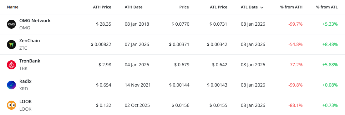 이들 종목은 8일 기준 모두 사상 최저가(ATL)를 기록한 직후 소폭 반등한 상태다. OMG 네트워크와 라딕스는 장기 고점 대비 99% 이상 하락한 상태에서 역사적 저점 영역을 형성하며 극단적인 가치 훼손 국면에 머물러 있다. 젠체인과 트론뱅크 역시 최근 며칠 사이 연속적인 저점 갱신 이후 제한적인 기술적 반등만 나타난 모습이다. 이번 집계에서는 총 5개 종목이 신저점을 경신했다.
