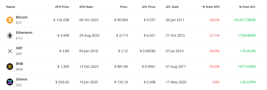 상위 5개 주요 자산은 모두 전고점 대비 30~50% 수준의 조정 국면에 머물러 있다. 비트코인은 상대적으로 조정 폭이 제한되며 시장의 중심축 역할을 유지하고 있는 반면, 솔라나는 고점 대비 낙폭이 가장 크며 변동성이 두드러진다. 이더리움과 BNB는 중간 수준의 조정률을 보이며 대형 알트코인 전반의 압축된 흐름을 반영하고 있고, XRP 역시 장기 고점 부담이 해소되지 않은 상태다. 전반적으로 대형 자산군은 급락보다는 박스권 조정 속에서 다음 추세 전환을 모색하는 국면으로 해석된다.
