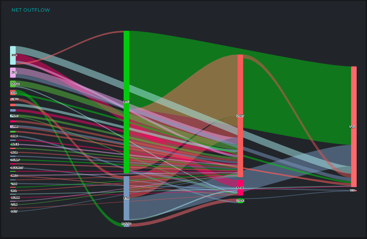 자금 유출 흐름을 보면 BTC에서는 총 3억8580만 달러 규모의 유출이 집계됐다. 이 가운데 달러로 2억1190만 달러, USDT로 1억6690만 달러가 이동하며 현금화·스테이블코인 전환 흐름이 집중됐다.