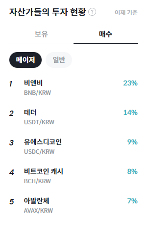 빗썸 집계에 따르면 메이저 코인 매수 비중에서 비앤비(BNB)가 23%로 가장 높은 비중을 기록했다. 이어 테더(USDT)가 14%, 유에스디코인(USDC)이 9%로 뒤를 이었으며, 비트코인 캐시(BCH)와 아발란체(AVAX)는 각각 8%, 7%를 기록했다. 달러 스테이블코인과 시가총액 상위 메이저 알트코인을 중심으로 비교적 안정적인 매수 흐름이 나타난 모습이다.