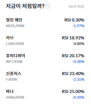 이 외에도 카브(CARV), 휴먼디파이(WET), 신퓨처스(F), 바나(VANA) 등 다수 종목이 RSI 30 이하의 과매도 구간에 머물러 있다. 특히 멀린 체인(MERL)은 RSI가 0%대 초반까지 하락하며 극단적인 과매도 상태를 보이고 있어, 단기적인 기술적 반등 가능성이 시장의 주목을 받고 있다.