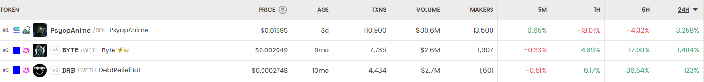 가장 크게 오른 거래쌍은 PsyopAnime/SOL (PsyopAnime)이다. 24시간 기준 3,258% 상승했으며, 가격은 0.01595달러로 기록됐다. 이어 BYTE/WETH (Byte)는 1,404% 오르며 0.002049달러에 거래됐고, DRB/WETH (DebtReliefBot)는 123% 상승하며 0.0002748달러를 나타냈다.