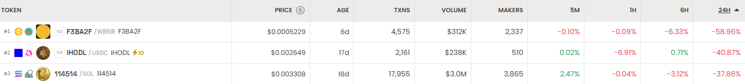 반면 가장 크게 하락한 거래쌍은 F3BA2F/WBNB (F3BA2F)로 24시간 기준 -58.96%, 가격은 0.0005229달러로 조정받았다. IHODL/USDC (IHODL) 역시 -40.87%를 기록했고, 114514/SOL (114514)는 -37.86%로 하락세를 보였다.