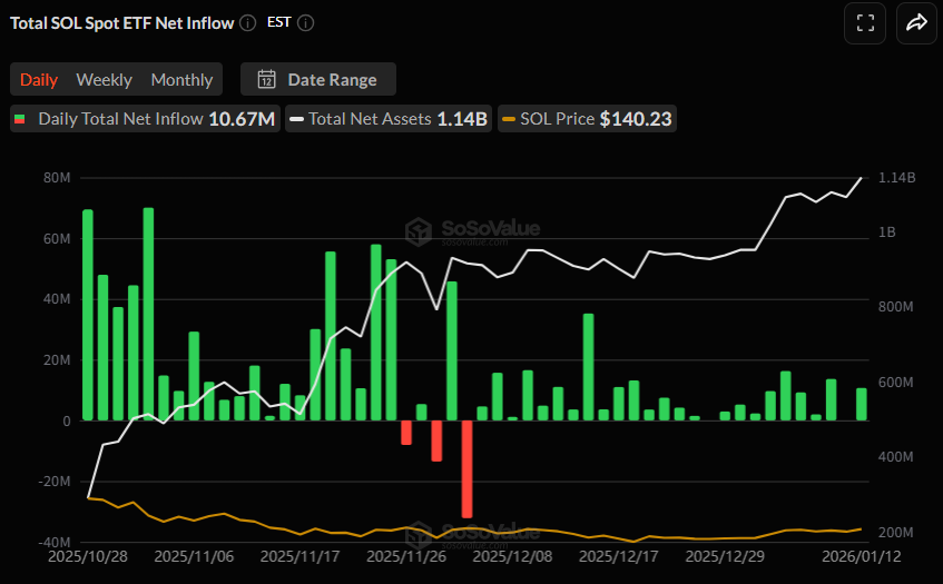 이날 자금 유입은 비트와이즈 BSOL에 집중됐다. BSOL에서 856만 달러의 순유입이 발생했고, 피델리티 FSOL로 165만 달러, 반에크 VSOL로 45만 달러가 추가 유입됐다.