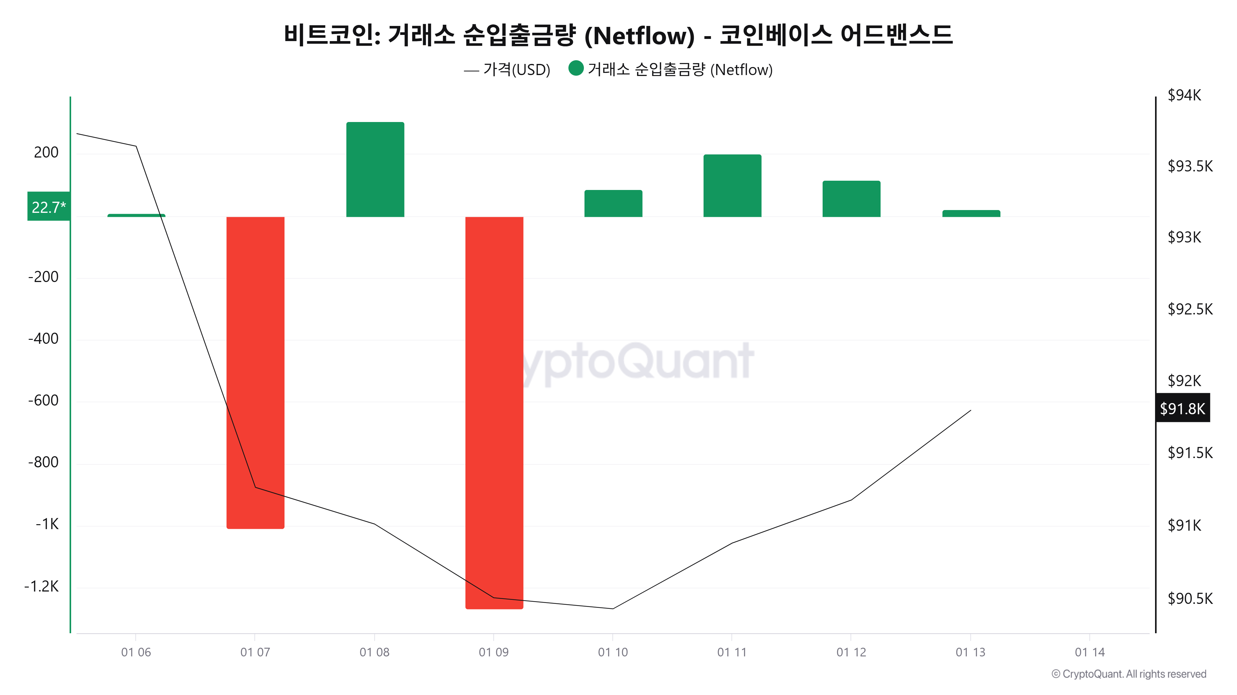 크립토퀀트 데이터에 따르면 1월 13일(UTC 기준, 미완결) 코인베이스 비트코인 순입출금은 +22.75BTC 순유입을 기록했다. 전일 대규모 순유입 이후 유입 규모는 둔화됐지만 순유입 흐름 자체는 유지되고 있다.