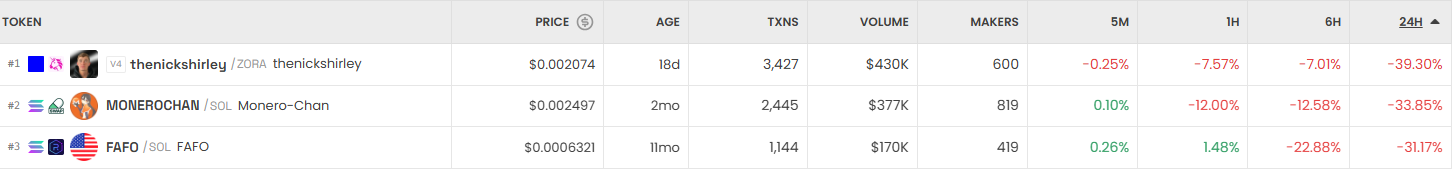 반면 가장 크게 하락한 거래쌍은 thenickshirley/ZORA (thenickshirley)로 24시간 기준 -39.30%, 가격은 0.002074달러로 조정받았다. MONEROCHAN/SOL (Monero-chan) 역시 -33.85%를 기록했고, FAFO/SOL (FAFO)는 -31.17%로 하락세를 보였다.